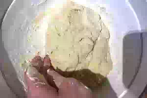 2. В отдельную миску просеиваем муку и добавляем в нее разрыхлитель. Просеивать нужно, для того, чтобы тесто стало более воздушным и легким. Теперь добавляем муку в жидкую основу и замешиваем тесто.