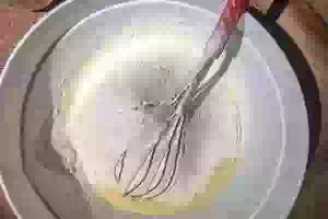 2. В отдельную миску просеиваем муку и добавляем в нее разрыхлитель. Просеивать нужно, для того, чтобы тесто стало более воздушным и легким. Теперь добавляем муку в жидкую основу и замешиваем тесто.