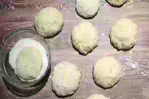 4. Формуем печенье. Для этого из теста скатываем небольшие шарики и придавливаем их руками. Если у вас есть формочки для печенья, можно немного раскатать тесто и вырезать уже готовую форму. Теперь обсыпаем заготовки печенья сахаром.