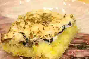 13. Горячую выпечку порезать на квадратики или прямоугольники приблизительно одного и того же размера. Готовое печенье с лимонной начинкой и безе можно подавать на стол.