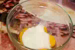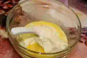 2. Подтаявшее сливочное масло выложить в чашу с желтками. Размешать все до однородности.