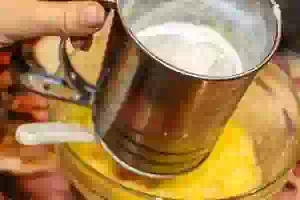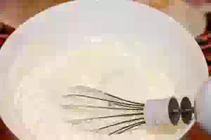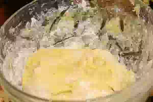 4. Соду в ложке погасить уксусом. Перелить гашеную соду в чашу с тестом в процессе замеса. Тесто отправить на 20 минут в холодильник.