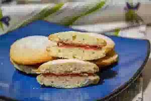6. Снимите печенье с противня и остудите его на решетке. На донышко остывшего печенья положите джем, густое варенье или вареное сгущенное молоко. Сверху накройте вторым печеньем и чуть-чуть прижмите его. По желанию можете присыпать печенье сахарной пудрой. Бисквитное печенье, которое тает во рту, без сомнения, добавит тепла и уюта на семейном или дружеском чаепитии.