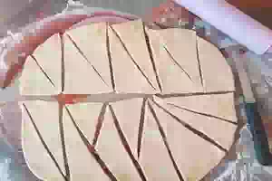 5. Смочите водой поверхность раскатанного теста. Нарежьте его на треугольнички, они могут быть совершенно разных размеров.