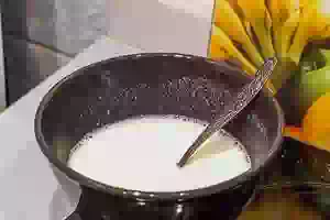 В другой миске соединить кефир, 100г сахара и соду. Хорошенько перемешать.