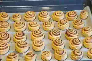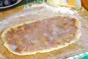 6. Тесто поделить на 2 части. Раскатать из одной части пласт в форме прямоугольника толщиной 5 мм. Смазать пласт теста растопленным маслом. Присыпать корицей с сахаром.
