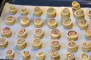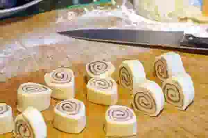 7. Из пласта теста свернуть рулет. Разрезать рулет на печенье около 1,5 см толщиной. Точно такие же действия проделать со 2 частью теста.