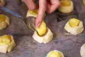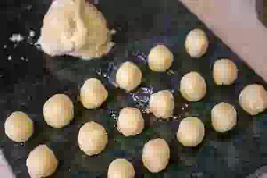 5. Переложить шарики на противень, застеленный бумагой для выпечки, оставляя между ними интервал 3 см. В середине шарика пальцем или подходящим приспособление (например, бутылочной пробкой) и сделать углубление, как показано на фото.