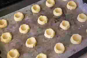 6. Каждое углубление заполнить апельсиновым курдом. Печь песочное печенье с апельсиновым кремом в предварительно разогретой до 180C около 10 минут. Как только печенье слегка зарумянится, сразу же можно достать противень из духовки. Дать печенью остыть и осторожно, т.к. оно получается очень хрупким, переложить лопаточкой на блюдо. Продолжить формовать и выпекать печенье из оставшегося теста. Песочное печенье с апельсиновым курдом готово.
