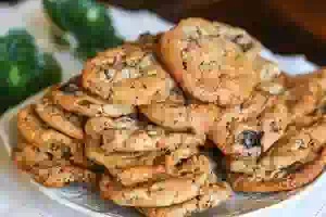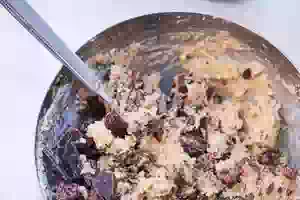 3. Шоколад поломать мелкими кусочками и добавить в тесто. Размешать, чтобы шоколад равномерно распределился в тесте. По желанию добавить несколько горсточек черной смородины, чтобы добавить в сладкое рассыпчатое печенье приятную кислинку.
