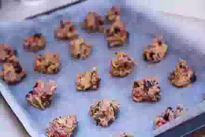 4. Столовой ложной выкладывать небольшие горки из теста на застеленный пекарской бумагой противень. Оставляя между ними промежутки не менее 3 см, т.к. во время выпечки печенье растекается. Выпекать в предварительно прогретой до 180С духовке 10-15 минут. Готовое печенье будет золотисто-коричневого цвета. Оставить печенье на противне, и когда она остынет, переложить на тарелку.