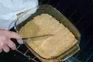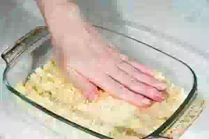 3. На противень (или жаропрочную форму) размером 30х20 выложить смесь, разровняйте ее, слегка прихлопните ладонью. Ножом сделайте неглубокие насечки в месте разреза печенья на части.