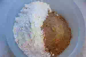 2. В другой миске растереть венчиком или миксером размягченное сливочное масло с коричневым сахаром.