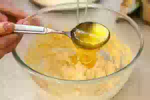 4. К взбитой массе влить мед и перемешать. Если мед твердый, то предварительно растопить его на водяной бане или в микроволновке.