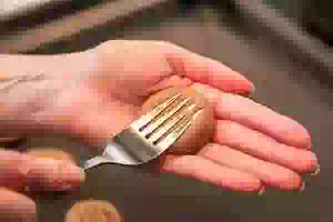 8. Слегка приплюснуть печенье на ладони и прижать вилкой, чтобы на поверхности отпечатался рисунок.