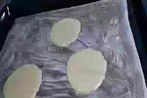 4. Аккуратно наливаем тесто в форме круга. Ставим в разогретую духовку. Минут 7 пекутся кружочки. Больше трех у меня не вышло выпекать, т.к. их сворачивать надо пока они горячие: снимаем с пергамента лопаткой готовое печенье, в него вкладываем листик с предсказанием, складываем раз пополам и два пополам. Надо делать быстро, пока горячие! Застыв, должны печеньки стать хрустящими.