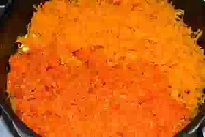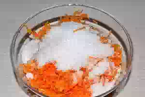 3. Переложите морковь в миску и посыпьте сахаром. Отставьте в сторону до тех пор, пока морковь не пустит сок.