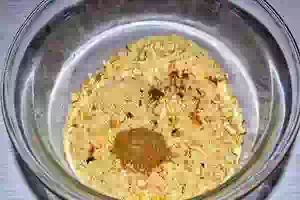 6. Подготовьте специи: корицу, молотый имбирь и мускатный орех. Добавьте специи к измельченному печенью. Перемешайте их с крошкой.