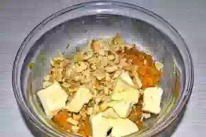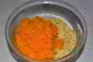 7. Теплые, но не горячие, морковь и тыкву положите к измельченному печенью. Ложкой перемешайте до однородной массы.