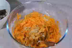 2. В другой миске смешать просеянную муку, разрыхлитель, соду, корицу, тертую на крупной терке морковку. Вылить яичную смесь в мучную и хорошенько перемешать.