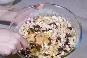 3. Шоколад наломать маленькими кусочками и добавить в тесто для печенья вместе с овсянкой и изюмом. Вымесить мягкое тесто, после чего накрыть миску с тестом полотенцем и оставить на столе примерно на час.