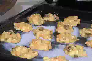 4. Нагреть духовку до 180С. Противень смазать маслом, присыпать мукой. Чайной ложечкой выкладывать тесто на противень, оставляя интервалы около 4-5 см. Выпекать 10-15 минут, пока печенье не станет золотисто-коричневого цвета. Готовое печенье переложить на решету и посыпать сахарной пудрой.