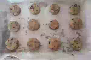 7. Вылепляем кружочки. Можно раскатать тесто в пласт и вырезать кружочки, а я просто расплющила шарики теста. Выпекаем песочное печенье с шоколадной крошкой 20-25 минут при t 190°С, в общем, до готовности. Все зависит от духовки.