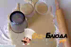 4. Раскатайте тесто в пласт толщиной 5 мм, вырежьте стаканом кружочки.
