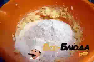 1. В чаше соединить сливочное масло или маргарин с сахаром. Взбить миксером до соединения продуктов.