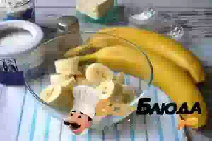 1. С бананов снимаем кожуру и нарезаем их на кусочки. Посыпаем 1 столовой ложкой сахара, благодаря сахару мы разомнем бананы равномерно.