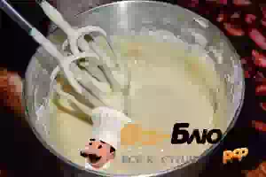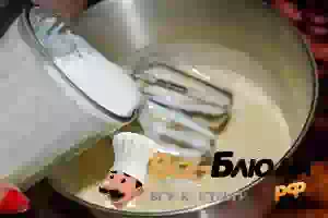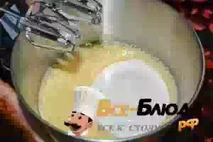 2. В ту же миску пересыпать сахар, размешать, а потом хорошенько взбить до полного растворения сахара. Масса станет еще белее.