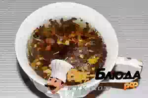 3. В тесто добавляем остывшую заварку, соду (или разрыхлитель). Соду лучше погасить небольшим количеством яблочного уксуса. Должно получиться довольно жидкое тесто. Так как пирог готовится очень быстро, то особенно заморачиваться с тестом не нужно, опытная хозяйка на глаз определяет нужную консистенцию.
