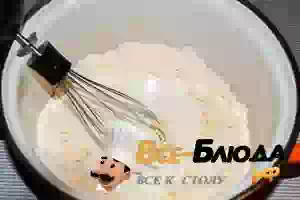 2. Для приготовления теста будем использовать белки и желтки по отдельности. Белки взбиваем с сахаром до крутой пены. Так бисквит будет более воздушным и лучше поднимется. Желательно яйца оставить на полчаса вне холодильника, чтобы они дошли до комнатной температуры. Вводим желтки и муку, хорошо замешиваем.