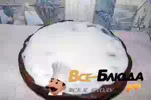 5. Пока пирог выпекается, взбить миксером жирную сметану и сахарную пудру. Чтобы крем позже застыл на поверхности, добавить чайную ложку лимонного сока.