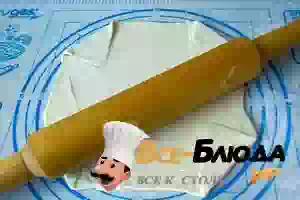 2. Размороженное тесто раскатаем на столе, придавая ему форму круга диаметром 23 см. Форму для пирога слегка смазать маслом, а можно и не делать этого. Укладываем раскатанный пласт теста в форму, оставляя небольшой бортик. Теперь поставим корж выпекаться в духовку, разогретую до 180С, на 10 минут.