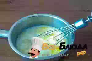 3. Тем временем займёмся заварным кремом. Приготовим всё, что нам понадобится: молоко, сахар, ванилин, крахмал. Разогреем в кастрюле или сотейнике молоко с сахаром. Снимем молоко с плиты, вобьём туда яйца, добавим ванилин и крахмал. Ещё прогреем на небольшом огне, постоянно взбивая, но не кипятим, чтобы не свернулись яйца. Готовый крем процеживаем через сито и остужаем.