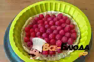 4. Корж достаём из духовки, слегка остужаем. Выкладываем на него малину в один слой. Количество малины указано примерное. Её нужно столько, чтобы полностью покрыть корж, а это может быть больше, чем один стакан.
