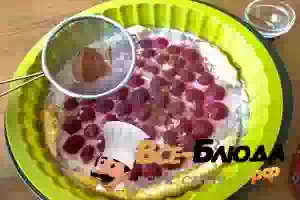 6. Готовый малиновый пирог остужаем и посыпаем какао. Это лучше сделать через сито для равномерного покрытия. Нежный открытый пирог можно подать к чаю или кофе, им можно позавтракать или поужинать.