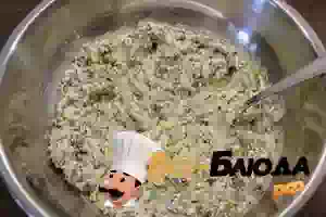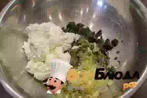6. Смешать все ингредиенты начинки: зелень, творог, яйцо.