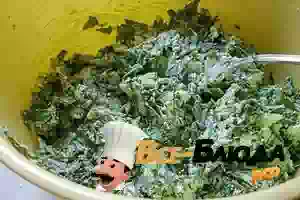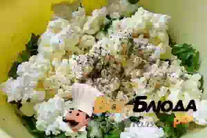 1. Для начинки крошим брынзу в мелко нарезанный шпинат. Добавляем рубленый лук. Перемешиваем, солим, перчим и поливаем растопленным сливочным маслом.