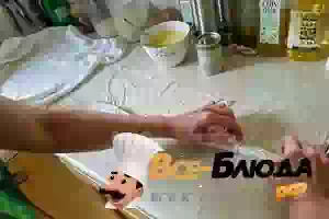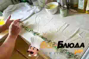 4. Смачиваем льняное полотенце водой. Им мы будем накрывать стопку листов теста фило, пока работаем с одним из них. Тесто очень тонкое и сохнет моментально. Раскладываем 2 листа рядом, немного внахлест короткими сторонами и смазываем хорошенько молочно-масляной смесью.