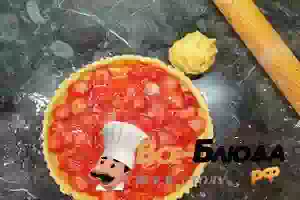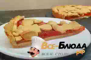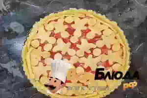 7. Их остатков теста вырезать формочкой для печенья фигурки и разложить поверх начинки пирога. Можно выложить просто полосочками.