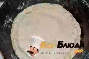 2. Из оставшегося теста слепить жгут и уложить его по центру лепешки таким образом, что разделить пирог на 4 равных сектора.