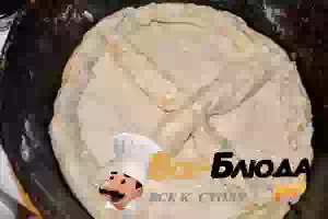 1. Готовое тесто разделить на не равные 2 части: одну используем для основы, вторую - для оформления пирога. Большую часть теста раскатать толщиной около 1 см и уложить на дно огнеупорной формы. От второго куска теста отделить примерно половину и слепить полоску. Уложить её по краю лепешки на дне формы, формируя бортик.