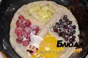 4. Поверх масла выложить ягоды и фрукты, посыпать их сахаром. Поставить форму с тесто в духовку, разогретую до 180С. Выпекать примерно 25 минут. Готовый фруктово-ягодный пирог с разными начинками подавать к столу горячим.