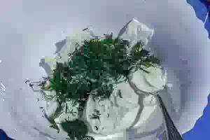 1. Заранее, примерно за полтора часа достать тесто из морозильной камеры и оставить размораживаться в холодильнике. Приготовить начинку. Перемешать измельчённую зелень (подойдет, к примеру, замороженный укроп) и сыр рикотта. Посолить и поперчить сырную массу по вкусу. Если в доме не нашлось мягкого сыра, замените его творогом.