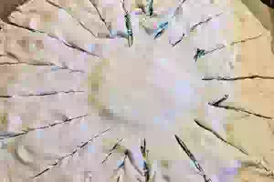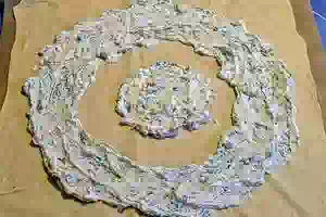 2. Отрезать кусок бумаги для выпечки по размеру формы для выпекания. Половину теста раскатать прямо на бумаге. Затем обозначить чашкой или пиалой середину будущего цветка. Сырную смесь переложить в пакет, отрезать у пакета кончик, выдавить начинку, заполнив частью смеси середину теста. Остальную начинку равномерно распределить вокруг, отступив от середины 5 см.