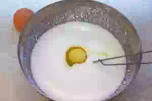 Замесить тесто для заливного пирога с черемшой. В миску подходящего объема налить кефир добавить яйца и размешать их венчиком. Вместо кефира можно взять простоквашу, сметану или йогурт. Посолить и положить сахар.