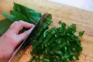 3. Пока расстаивается тесто, пучок черемши промыть под проточной водой, обсушить на полотенце. У листьев черемши отрезать жесткие белые кончики. Остальную часть листа я нарезать полосками. Сложить зелень в миску, посолить и слегка помять.