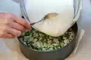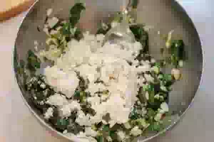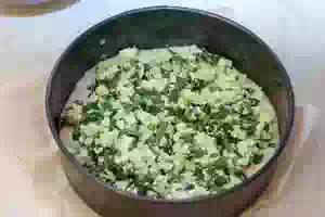 7. На слой теста равномерно распределить начинку с черемшой, стараясь оставлять свободными края, чтобы во время выпечки начинка не припеклись к стенкам формы.